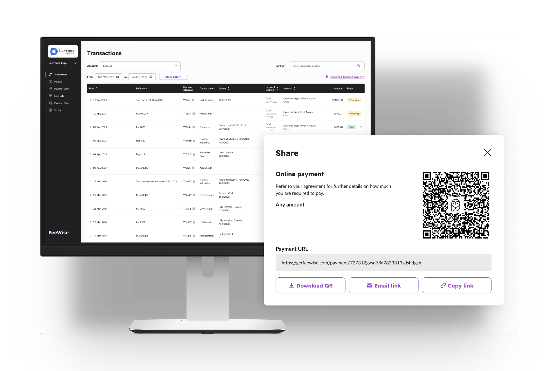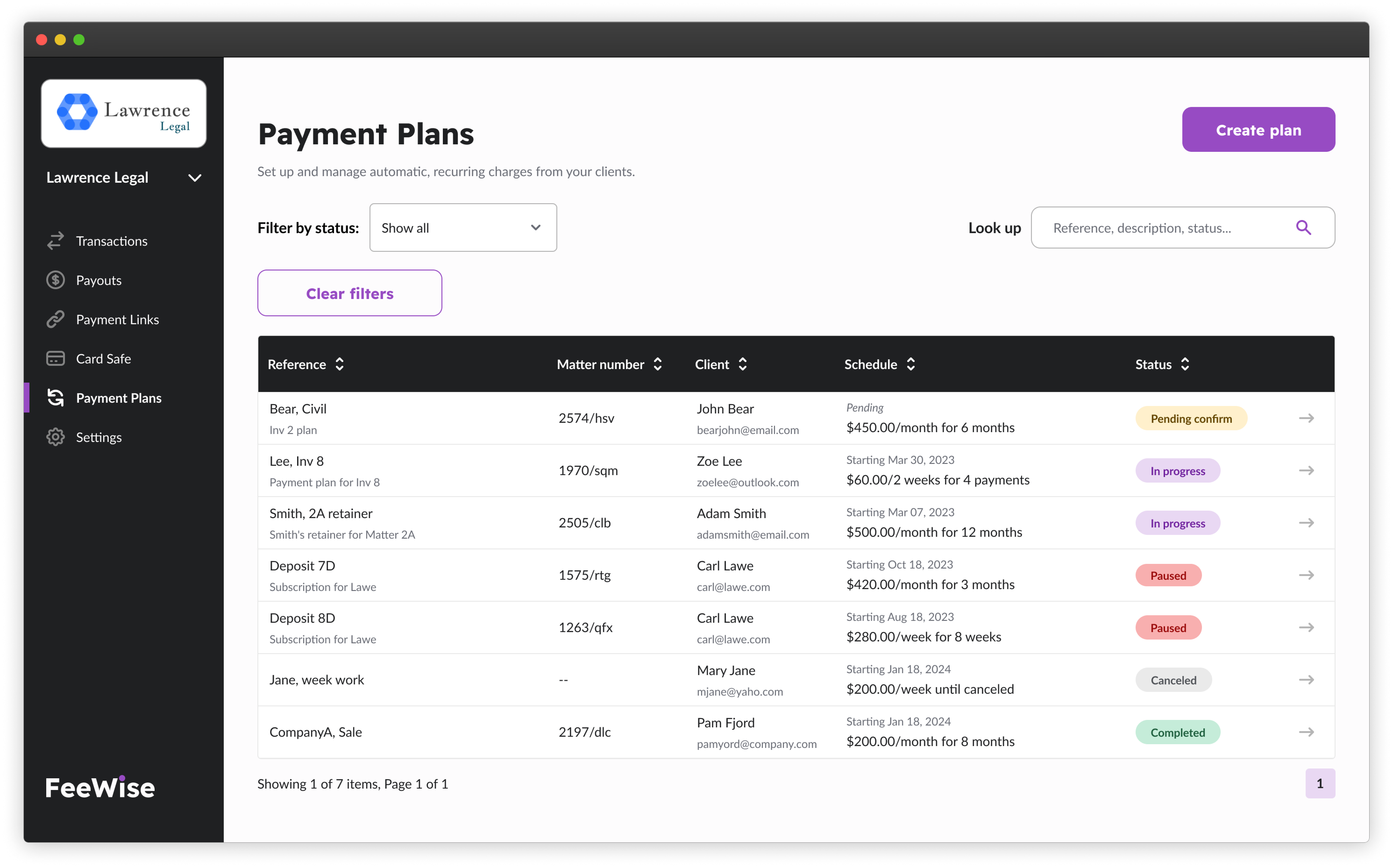 Schedule automatic recurring payments within your Online Payments dashboard. With Payment Plans, your firm can automate retainer collections or split payments over multiple instalments, collected automatically. Card data is stored securely with bank-grade encryption.
